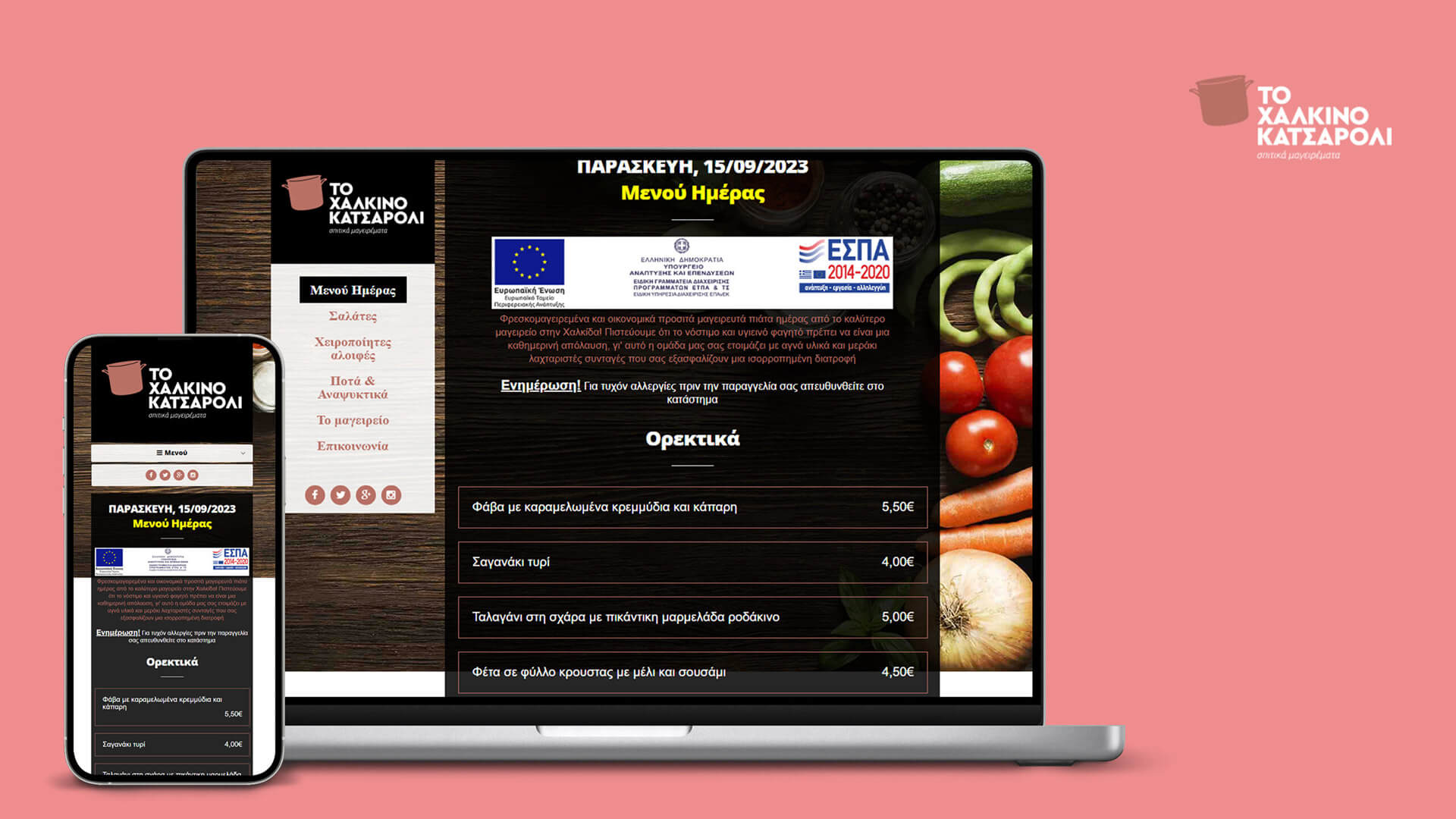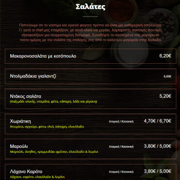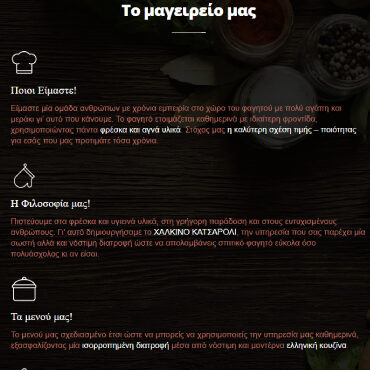Ε ίμαστε μία ομάδα ανθρώπων με χρόνια εμπειρία στο χώρο του φαγητού με πολύ αγάπη και μεράκι γι’ αυτό που κάνουμε. Το φαγητό ετοιμάζεται καθημερινά με ιδιαίτερη φροντίδα, χρησιμοποιώντας πάντα φρέσκα και αγνά υλικά. Στόχος μας η καλύτερη σχέση τιμής – ποιότητας για εσάς που μας προτιμάτε τόσα χρόνια.