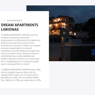 Το DREAM APARTMENTS LIMIONAS είναι ένα σύγχρονο συγκρότημα πολυτελών διαμερισμάτων που βρίσκεται στην καρδιά της Εύβοιας στον μαγευτικό Λιμνιώνα. Είναι χτισμένο στην κορυφή του λόφου του οικισμού Λιμνιώνα εναρμονισμένο στο φυσικό περιβάλλον με μεγάλα λιθόκτιστα τμήματα και εξαιρετική αρχιτεκτονική.